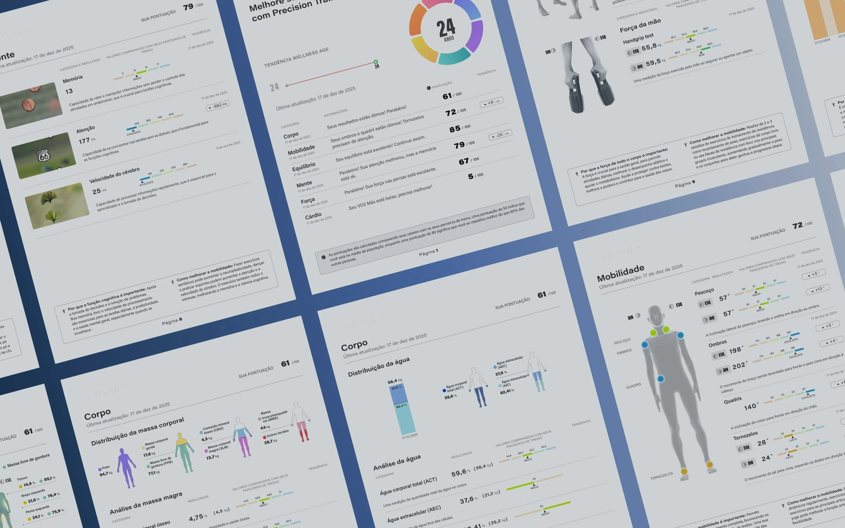 Os dados geram um relatório claro e acionável, adaptado ao seu perfil — Health, Performance ou 60+ — que serve como ponto de partida para sua jornada e como uma ferramenta poderosa de autoconhecimento para compartilhar com sua equipe de saúde.