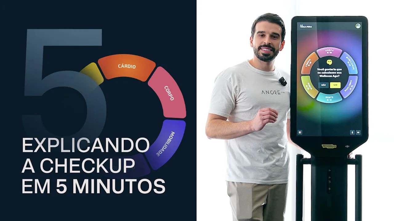 Antes de traçar a rota, precisamos do mapa. Nosso Checkup Ancre Gym by Technogym é o diagnóstico mais avançado de saúde funcional disponível. Em uma única sessão, avaliamos seus seis pilares de performance: Força, Cardio, Equilíbrio, Mobilidade, Composição Corporal e Mente.